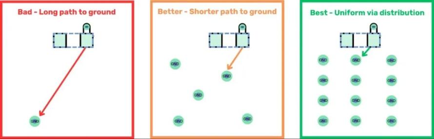 为电流提供一条短的回地路径,可以确保实现低阻抗的回流路径。这也能最大限度地减少形成“地环路”(Ground loops)的可能性,而地环路会产生辐射发射(radiated emissions),并恶化信号完整性(Signal Integrity)和电磁兼容性(EMC)。