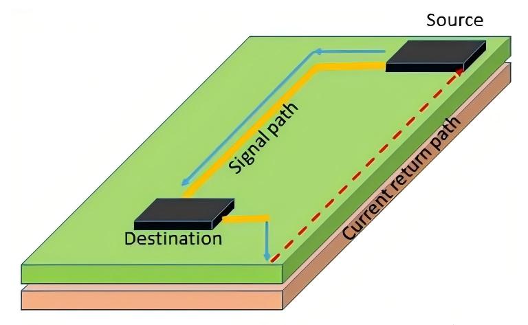 所有电流都会从源端流出并返回源端,形成一个完整的电路回路。回流电流总是会选择阻抗最低的路径。在低频时,这条路径由最低的电阻决定;而在中高频时,回流电流则会沿着电感最小的路径流动。