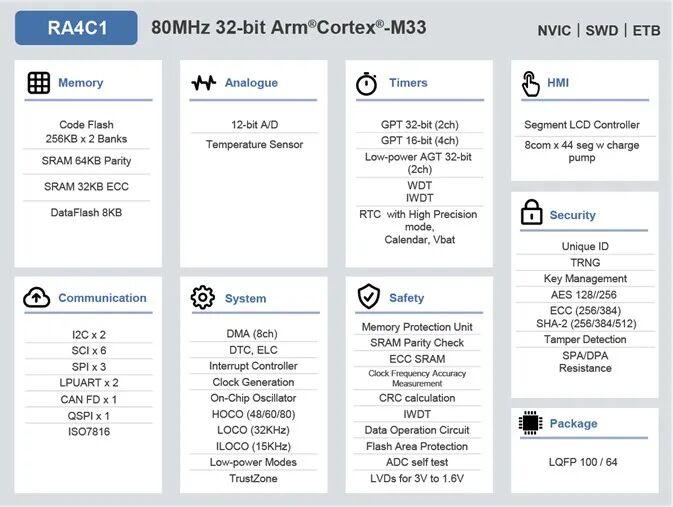 为了确保低功耗,许多低功耗外设,如低功耗定时器、低功耗UART和段码式LCD控制器都集成到80MHz RA4C1微控制器(MCU)中。为了减少网络安全威胁,内置一个片上安全引擎,为安全功能提供了与CPU的隔离,并包括密钥管理和密码算法的硬件加速,如AES、ECC和SHA被内置到RA4C1 MCU中。有关更多信息,请查看以下RA4C1框图。
