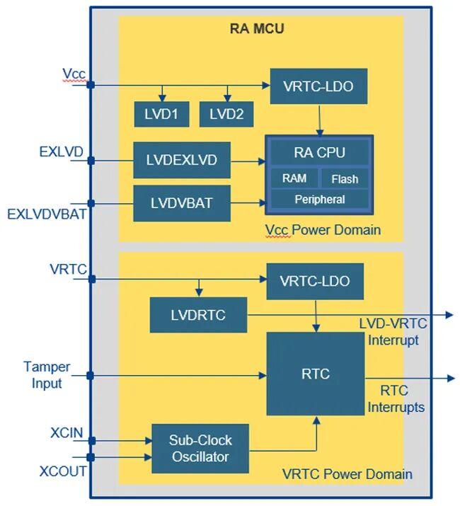 CPU、片上存储器和除RTC之外的所有外设的电源均由Vcc供电。RTC是独立电源域的一部分,通过Vrtc引脚独立供电。