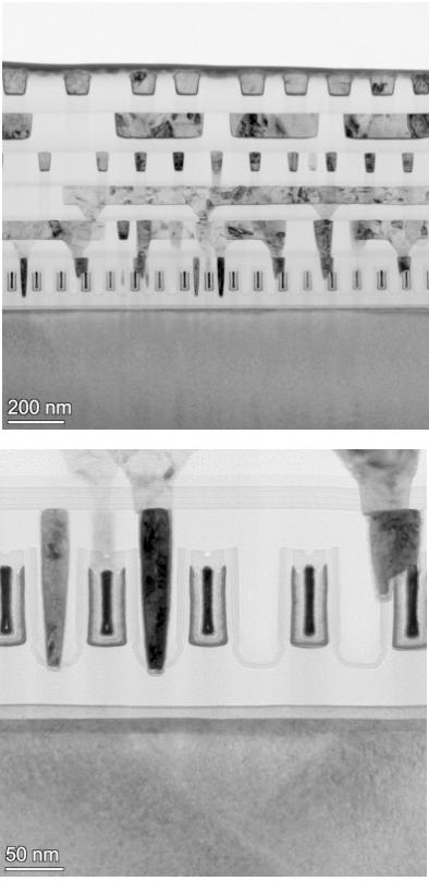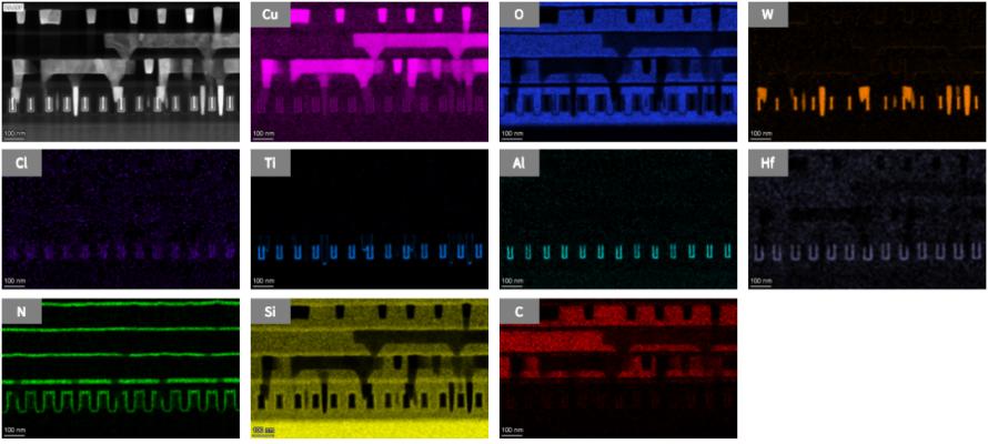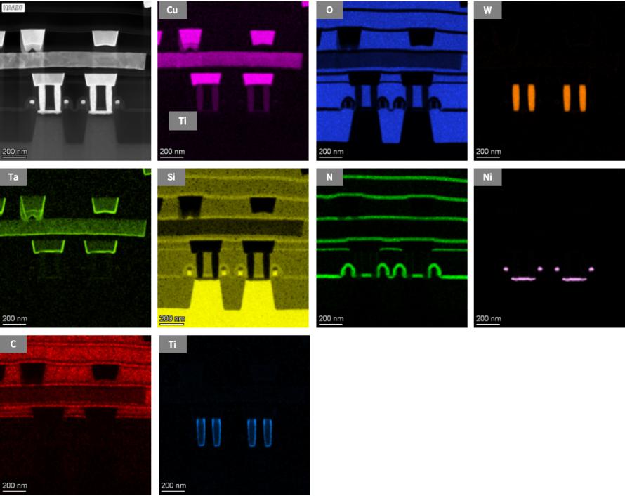 有序微结构:TEM观测到高度规则的50-80nm重复单元,符合SRAM缓存单元或数字逻辑电路栅极的典型特征,推测为芯片核心运算区域(如CPU/GPU 运算模块)。