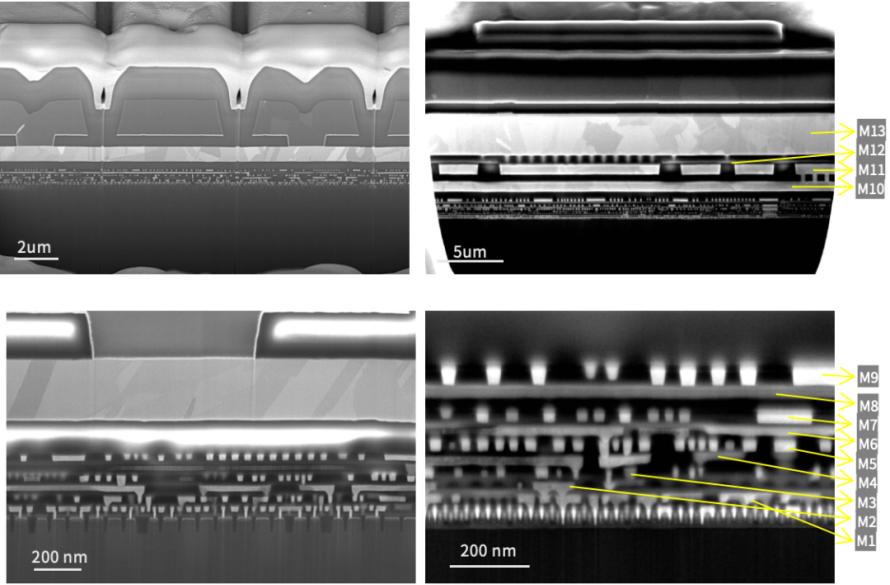 先进制程工艺:通过FIB截面分析,确认FIB图像确认原厂芯片采用FinFET先进工艺,具备13层金属互联结构,其中最薄金属厚度控制在≤100nm。