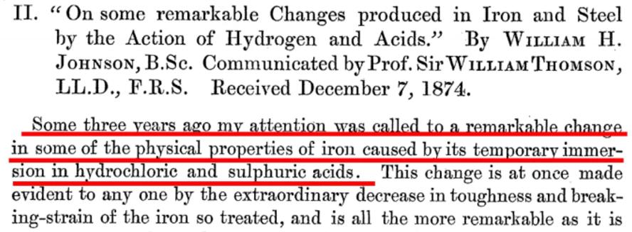 氢脆现象的发现:最早可追溯到18世纪70年代,当时在英国钢铁行业工作的冶金学家William H. Johnson,在研究中发现了一个困扰整个拉丝行业的谜团:为清除铁丝和碳钢丝储存中表面的锈迹,通常会将其浸入含酸水的浴槽中,但清洗后铁丝和碳钢丝的韧性出现了降低,这种机械性能退化的原因在当时无法解释。1875年Johnson在《Proceedings of the Royal Society of London》和《Nature》杂志上发表了系统性的论文,详细阐述了这一现象。由于当时实验条件的限制,Johnson提出了一个合理的科学假设,为金属和合金的氢脆科学奠定了基础,即酸对铁表面作用产生的部分氢气被吸收,随后释放出来,影响了金属的性能。
