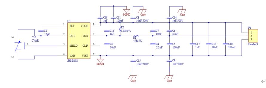1、C2为参考电容,容值需与陶瓷压容芯体配套,不是固定值。