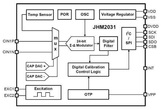JHM2031是一款针对电容式传感器设计的的低功耗、高精度信号调理集成电路,搭配湿敏电容,使用芯片内置的温度传感器,可用于测量环境温湿度。JHM2031内置24-bit ΣΔCDC电路,将电容及温度转换为数字信号,再经过芯片内置算法,转换为当前环境的温湿度并输出。