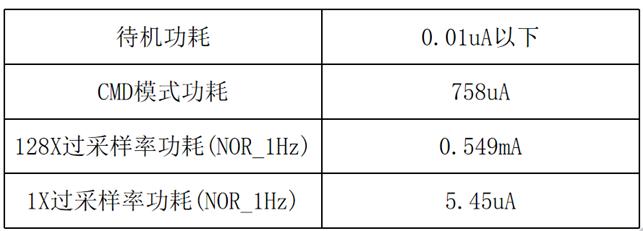 JHM2031属于低功耗调理芯片,功能测试如下:待机电流在0.01uA以内,NOR模式下128过采样率时,1Hz功耗约0.549mA。