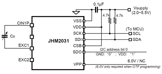 JHM2031温湿度应用时,属于单点容测量(芯片本身支持单点容,差分电容,全桥电容三种测量方式),典型应用如下:其中Cx为湿敏电容,通过简单的外围电路(去耦电容,IIC上拉电阻),即可实现对环境温湿度的测量。