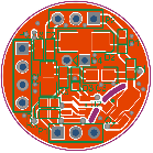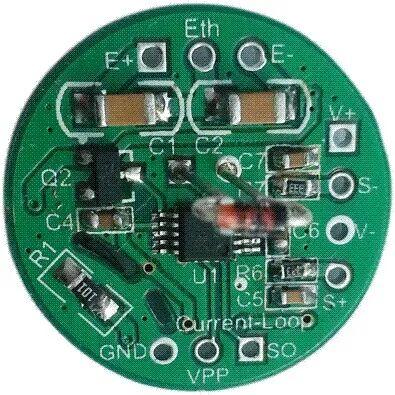 这个设计可以采用圆形双层PCB,直径为20mm,如图4所示。这个尺寸的PCB在变送器设计中很常见,稍加改动就可以轻松实现实际应用。由于PCB尺寸较小所以元件的放置就比较紧密,JHM1101由于可能使用内部温度传感器所以和测温二极管及低通滤波元件放置于底层,也就是最靠近Sensor的位置。V/I转换及外部保护元件则放置于顶层。PCB板实物如图5所示。
