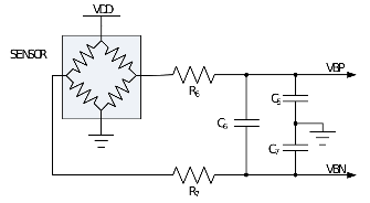 此输入滤波器同时具有共模组件和差模组件。由于传感器电压信号是一个直流信号,为减弱任何可能出现的交流噪声,这个低通滤波器的截止频率可以设置为一个非常低的值。