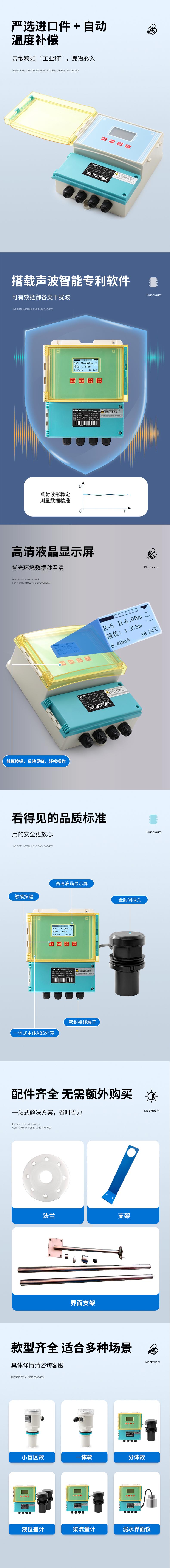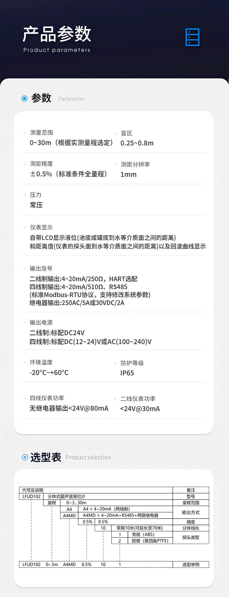 LFUD102分体式超声波液位计安全清洁、精度高、寿命长,运行稳定且安装维护便捷,搭载声波智能专利软件抗干扰,适用于酸、碱、盐、防腐、高温场景,输入输出线防雷防短路;带LCD屏显液位、距离值及回波曲线,输出含二线制4~20mA(可选HART)、四线制4~20mA/RS485(支持Modbus-RTU)与继电器输出,电源适配灵活,-20℃~+60℃环境、IP65防护可适应多工业场景,选型上量程0~3m-30m可选,探头有常规ABS与防腐PTFE材质,分体线长常规10米(可延至70米)
