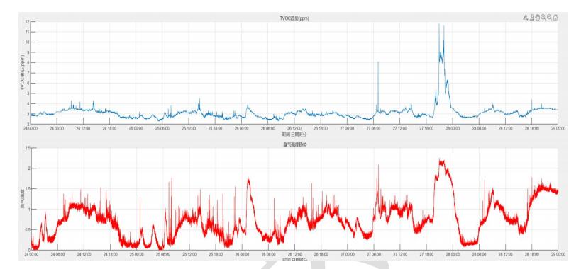 △分析报告内对杜阮某小区气味浓度变化趋势及TVOC浓度变化趋势对比
