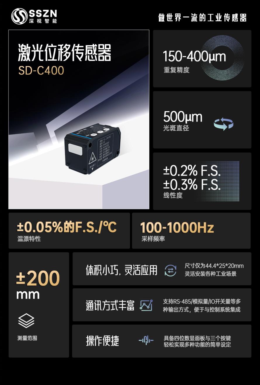 深视智能SD-C400激光位移传感器兼具高精度与大量程:当检测距离在200-400mm时,重复精度达0.15mm,较传统超声波传感器(1-2mm精度)提升近10倍,可精准捕捉微米级变化。