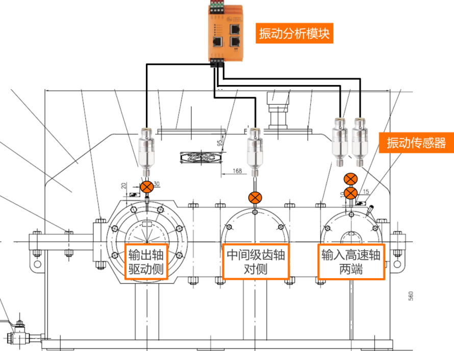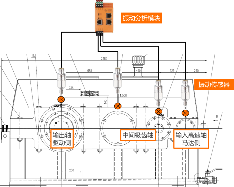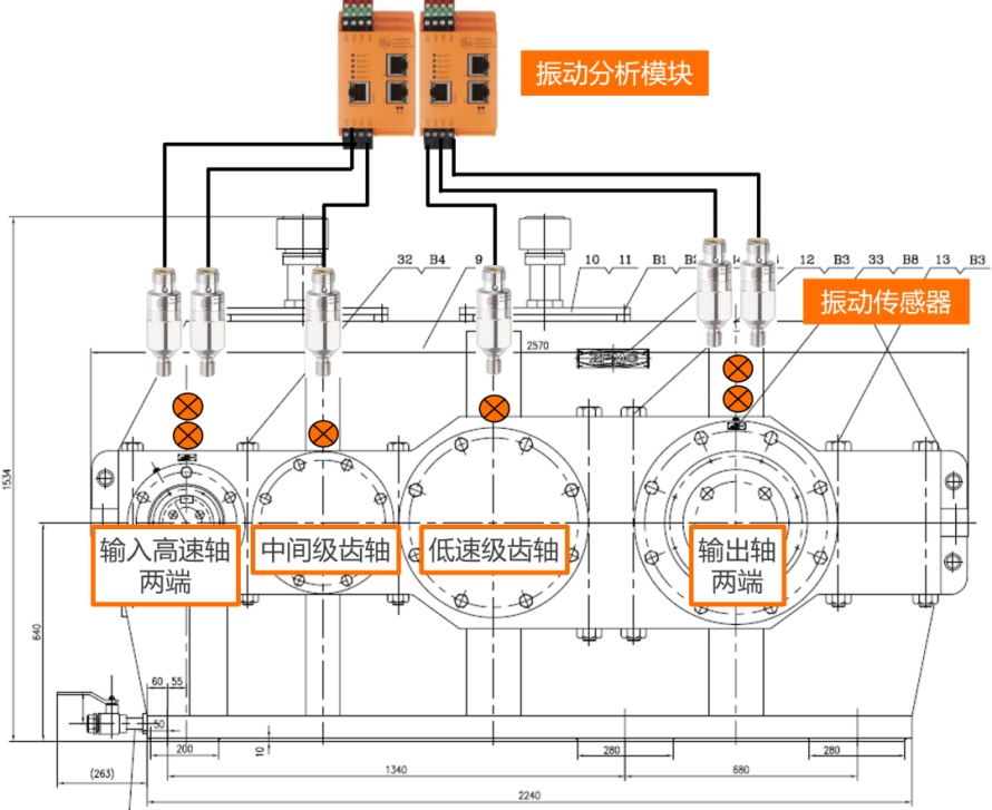注:图中所示减速箱监测点,需配合驱动电机两端、钢绳卷筒轴承座等,构成完整监测链。