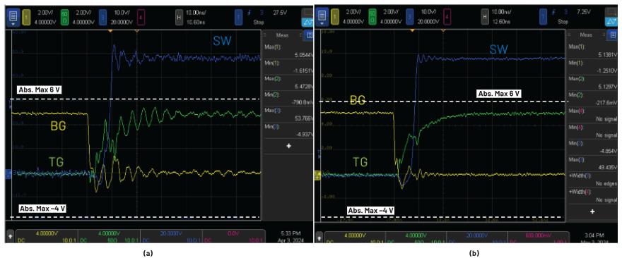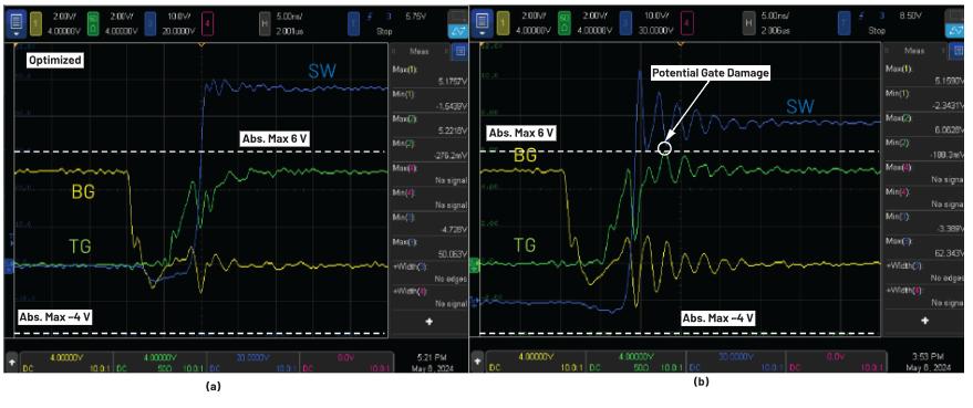 图8a显示了使用2 Ω的理想顶部栅极电阻时,降压转换器的一些典型波形。这些波形很干净,没有明显的过冲或振铃,表明抑制有效且开关特性得到了优化。相比之下,图8b突出显示了由于顶部栅极电阻(1 Ω)不足,导致顶部栅极信号出现过冲,超过6 V的安全阈值,可能会造成GaN FET损坏和EMI提高。