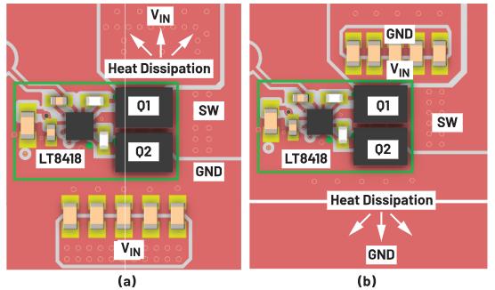 在降压转换器配置中,由于硬开关产生的损耗,顶部FET通常会经受更高的温度。为了增强散热,建议将高频热回路电容器放置在更靠近底部FET的位置。这种布置不仅能够优化高频环路的电气路径,而且在顶部FET周围提供了额外的空间,有助于改善散热。在这种布局中,内部第一层上的电源平面(位于Q1和Q2下方)是 VIN。这种布局策略的顶层如图5a所示。