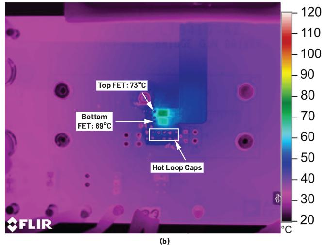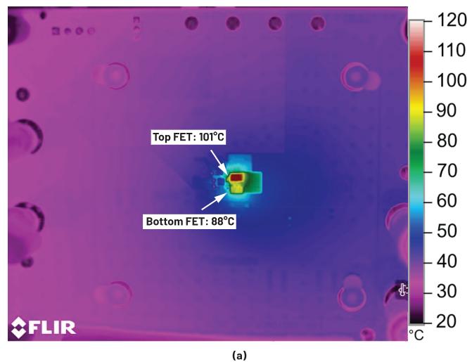 图7比较了两个由LT8418驱动的GaN降压电路板之间的温度差异。在相同工作条件下,采用推荐布局实践设计的电路板与设计糟糕的电路板相比,前者搭载的GaN FET的温度明显更低(相差最多28˚C)。