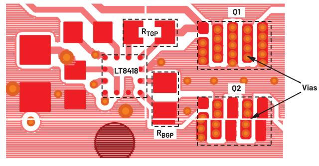 此外,这些通孔能够有效增强散热性能,将FET的热能传输到其他PCB层的铜平面,因此有助于维护器件在高功率运行期间的热完整性。通孔还能将电流分配到多个PCB层上,并能有效降低电阻。建议填充这些通孔,以防止焊接过程中放气和焊料泄漏,并提升散热和导电性能。