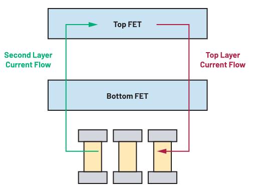 在这种布局中,高侧和低侧FET并排放置在同一PCB层上。并行布置可有效缩短互连走线的长度。多个热回路电容(低等效串联电阻(ESR)的陶瓷电容)也放置在同一层上,并直接毗邻FET的源极和漏极端子。这种布局利用内部第一层作为功率环路返回路径,此路径与顶层上的正向路径非常接近,从而有效缩小热回路的物理尺寸。由此还可确保热回路杂散电感与电路板总厚度无关。此外,正向和返回电流的感应磁场相互抵消,进一步降低了寄生电感。