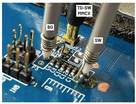 为了测量底部栅极和开关节点信号,建议使用低电容无源探头,并让弹簧接地引线靠近GaN FET的GND,以尽可能降低探头物理连接的影响。顶部栅极VGS信号以开关节点为基准,因此读取该信号较为困难。这项任务适合使用高速差分探头。为了获得更好的结果,此类光学差分探头通常需要搭配专用的MMCX连接器,如图9所示。