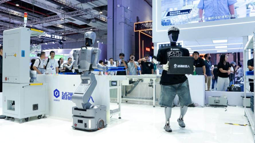 越疆机器人-双足人形机器人精准分拣物料,轮式机器人穿梭转运组件,多足机器狗在设备间隙搬运、移动,协作机械臂高速装配零件。