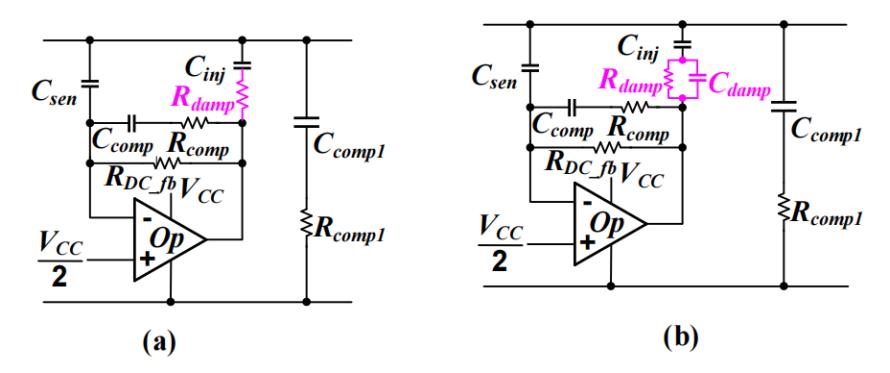 处理这一问题需要抑制谐振。图 2 显示的两种阻尼方法使 AEF 在谐振频率下具有较小的电容。在图 2 (a) 中,阻尼电阻器 Rdamp 被插入到注入路径中。这样,Rdamp 越大,谐振阻尼越佳。然而,插入阻尼网络后,方程式 2 将 AEF 的等效阻抗表示为: