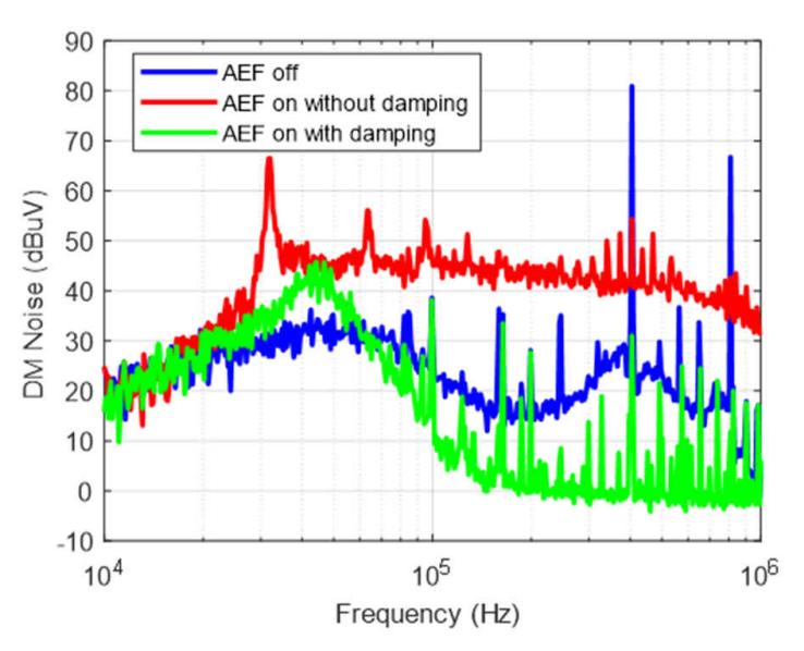 图 3 显示了 400 kHz 降压转换器在 10 kHz 至 1 MHz 范围内的频谱测试结果(对应于 AEF 关闭、AEF 开启但无阻尼、AEF 开启且有电阻器-电容器并联阻尼的情况),其中基于方程式 4 和方程式 5 选择 Rdamp 和 Cdamp。在图 4 中无阻尼的情况下,谐振会在大约 30 kHz 处出现尖峰,这会影响 AEF 性能并使本底噪声增加。使用阻尼网络后,谐振尖峰现在位于 45 kHz 处,但其幅度大大降低,这意味着已成功抑制谐振。因此,AEF 有效地抑制了高频噪声,并且本底噪声大幅降低。