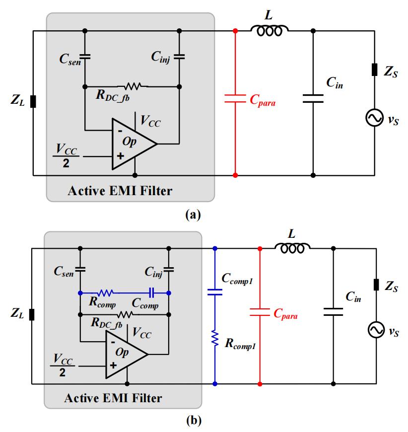 图 1 (a) 显示了一个无补偿的 AEF。在图 1 中,VS 是噪声源,ZS 是内部阻抗,ZL 是线路阻抗稳定网络或电源的阻抗,Cin 是电源转换器的输入电容器,L 是差模电感器,Csense 和 Cinj 是感应电容器和注入电容器,RDC_fb 为 Op_amp 提供直流反馈,Cpara 是电源布线和接地之间的寄生电容。