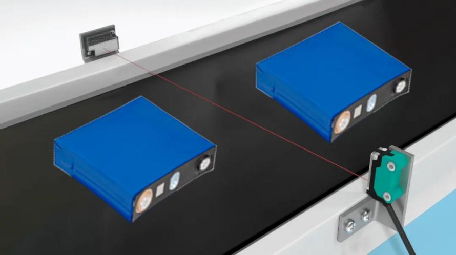 在电池生产中,R2/R3 系列激光光电传感器以其小巧外形、小光斑和高精度,适用于多种关键检测任务。在输送线上的电芯检测环节,如果遇到厚度较薄的电芯,常规的LED光源的光电传感器很难实现稳定的检测。