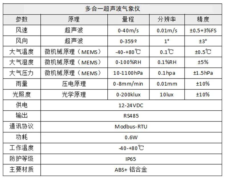 迷你超声波气象仪是一款全数字检测、高精度的多合一传感器。它创新性地集成了超声波风速风向传感器、高精度数字温度、湿度、压力传感器、雨量传感器及光照度传感器,能同时捕捉风速、风向、大气温度、大气湿度、大气压力、雨量、光照度等多项关键气象参数。