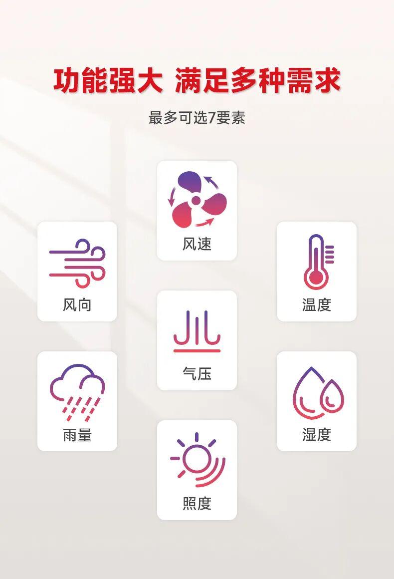 最多可同时监测风速、风向、温度、湿度、压力、雨量、光照度 7 项参数,无需额外搭配多个传感器,大幅简化系统搭建流程。
