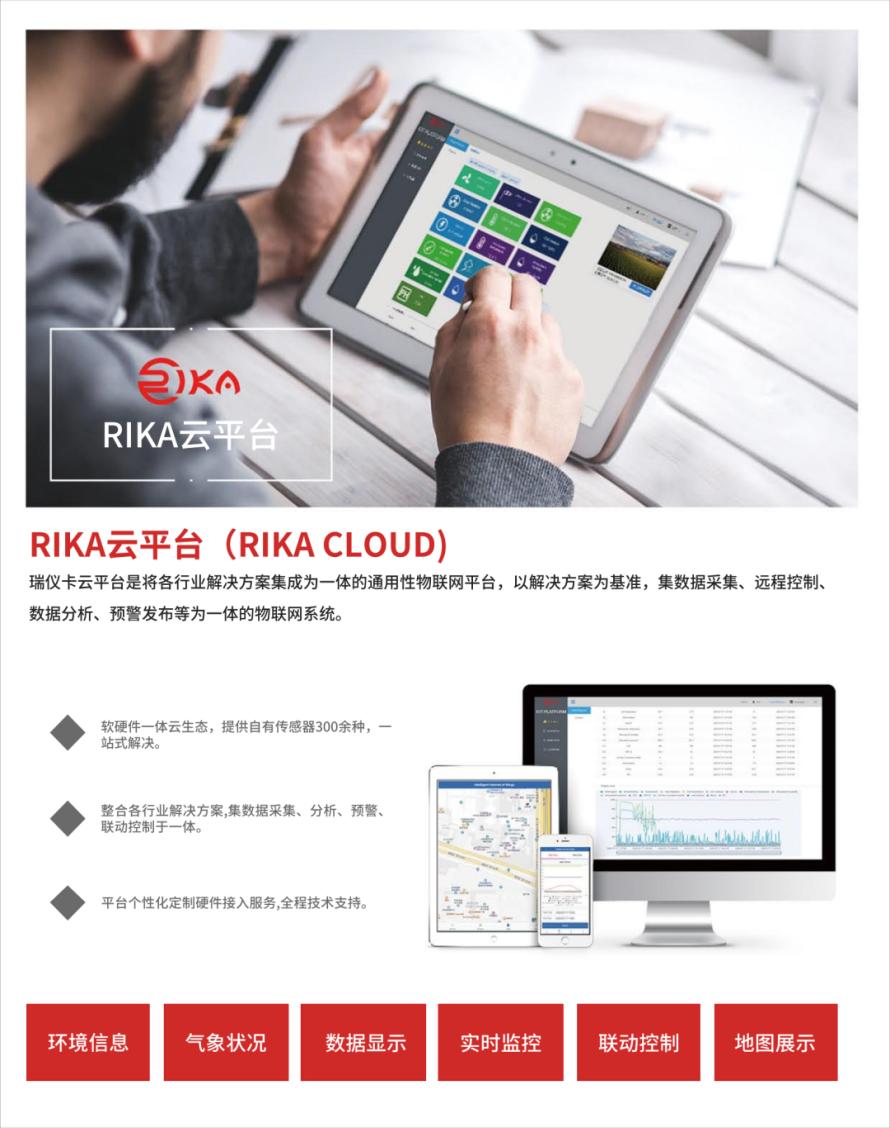 瑞仪卡云平台以先进的信息采集系统、物联网、云平台、大数据以及互联网等信息技术为基础,各级用户可通过PC端WEB、APP客户端等多种渠道访问平台数据,实现远程系统管理功能。