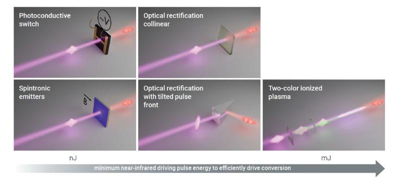 当前近红外至太赫兹转换效率仍很低,高功率驱动激光器成本可能成为瓶颈。正在探索近场局部场增强、腔中共振增强和优化激光驱动波长等替代增强策略。