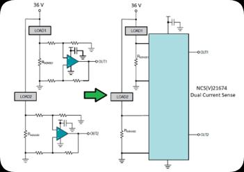 一大关键难题是上桥配置中的电流测量,其中的分流电阻并非以地为参考点。这就要求放大器需具备处理大共模输入电压的能力:部分型号的共模电压上限可达 40V,而像 NCS7031 或 NCV7031(汽车级)和 NCS7041 或 NCV7041(汽车级)等型号,共模电压上限甚至可达到 80V。这种能力对上桥和下桥电流检测意义重大:既为设计提供灵活性,又能在上桥应用中实现负载短路检测。