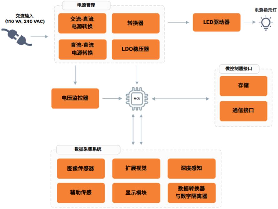 下面的框图展示了采用安森美 (onsemi) 推荐产品的机器视觉方案,该方案集成了多种图像感知和深度感知技术,运用了安森美的全局和卷帘快门传感器系列产品。电源管理、通信等大多数功能块器件均可从安森美的全面方案中获取。