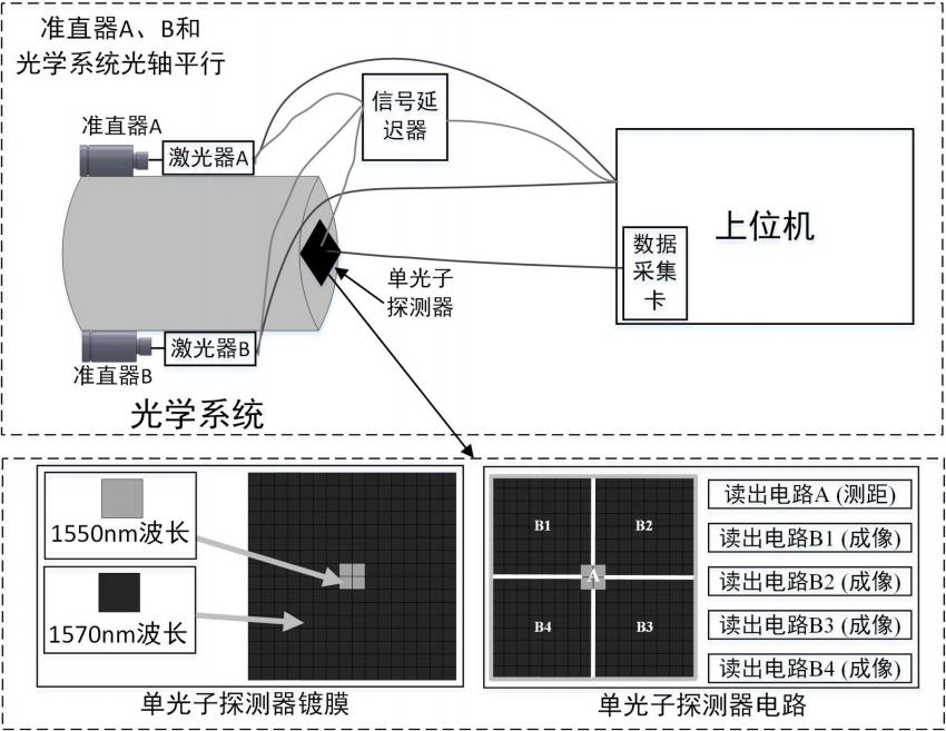 【系统结构示意图:激光器A/B、准直器、光学系统、单光子探测器、信号延迟器、上位机等组件连接关系】