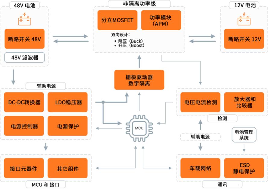 该应用场景的主流功率级拓扑采用非隔离式同步降压转换器。同步开关支持双向电流流动,实现升压模式。从48V侧观察时,该结构工作为同步降压转换器;而从12V侧观察时,它则表现为同步升压转换器。功率级的设计可采用分立MOSFET或集成化汽车电源模块(APM)方案。