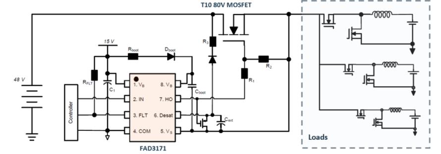 图示:应用示例原理图——FAD3171驱动T10 MOSFET作为48V电池主开关