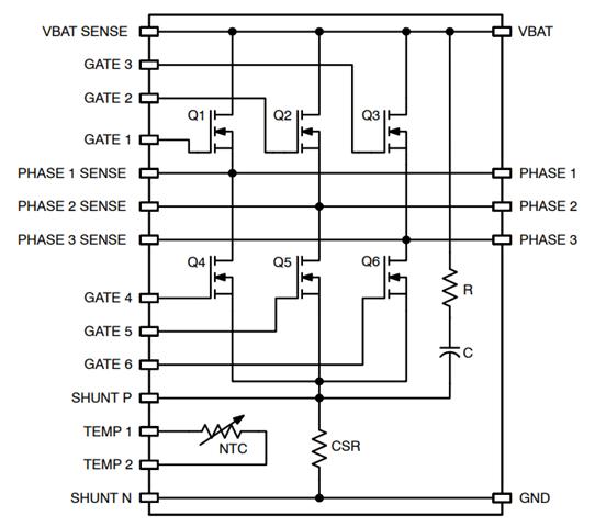 图示:APM19 3相模块内部布局:MOSFET桥、NTC、分流电阻和RC缓冲器