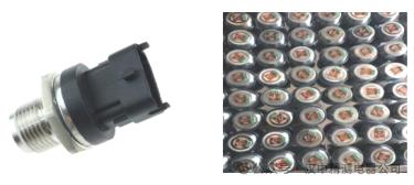 圆膜应变花作为压力传感器核心元件粘贴于传感器零件敏感部位-膜片表面,利用金属膜片的应变效应,将压力转换为电信号,从而来测量发动机共轨喷射系统中轨内燃油压力,产品耐受高温、经济性好、性能佳。