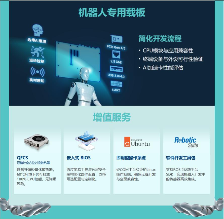 工业级主板负责协调传感、执行与电源模块之间的通信。为确保机器人运行流畅、精准且具备适应性,主板需采用坚固耐用、支持人工智能(AI)的设计,并具备轻量化外形。
