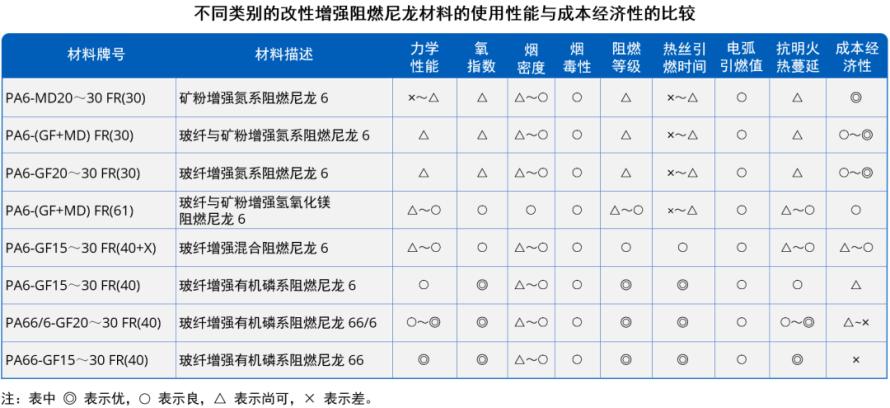 阻燃剂主要包括氮系(FR(30))、有机磷系(FR(40))、氢氧化物(FR(61)等)及复合阻燃体系等。在使用性能上,有机磷系的氧指数、热丝引燃时间、电弧引燃值、阻燃效果(V-0 阻燃等级甚至更高)最好,对力学性能的影响也较小;氮系阻燃剂的烟密度较低,但氧指数、热丝引燃时间、阻燃效果等方面相对较弱,对力学性能的影响较大;氢氧化物阻燃剂介于二者之间。在成本上,有机磷系阻燃剂的成本远高于其他种类。