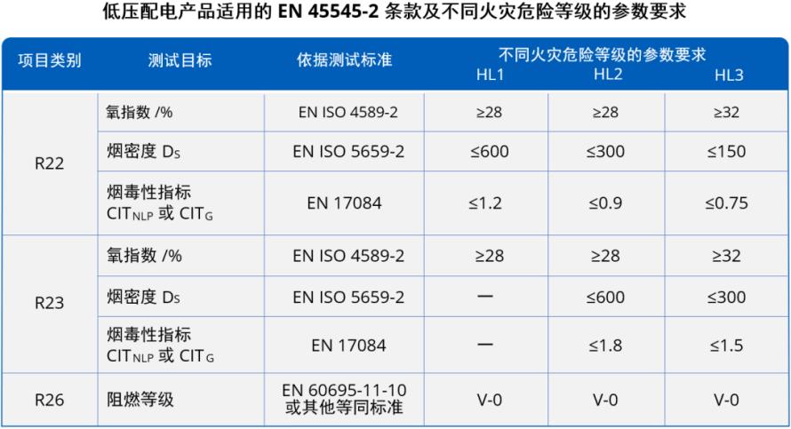 EN 45545-2 作为国际广泛采用的轨道车辆防火标准,将轨交车辆整体的火灾危险等级划分为 HL1 至 HL3( HL3 对轨交车辆材料防火性能要求最严格),并依据所使用材料用途和火灾风险程度设定了 R1-R28 共 28 个类别。其中,低压配电产品需要满足以下类别要求: