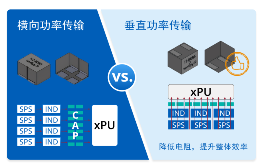 除了提升电感器的性能,优化 xPU 的供电结构也至关重要。在高电流路径中,采用垂直供电方式有效降低电阻,提升整体效率。同时,为实现高效电流传输,端子布局也需要优化。电感器已经从传统的底部端子发展为顶部与底部同时布设,这也进一步提升了电流传导效率与系统集成灵活性。