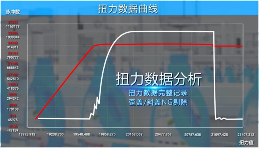 方案创新融合高动态响应伺服电机与AI控制算法,实现了“动态跟随式”旋盖——旋盖头可智能追踪流水线速度完成精准旋紧动作,单线效率提升15%-20%。更关键的是,方案还能实时采集每次旋盖的脉冲数、扭力值,生成“角度-扭矩”曲线进行监测、分析和完整记录,一旦发现由于歪盖、斜盖而导致的扭力数据异常,及时剔除不合格品;扭力数据还可进行追溯,从而实现“全过程监控”的质控模式升级。