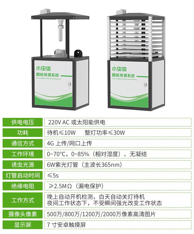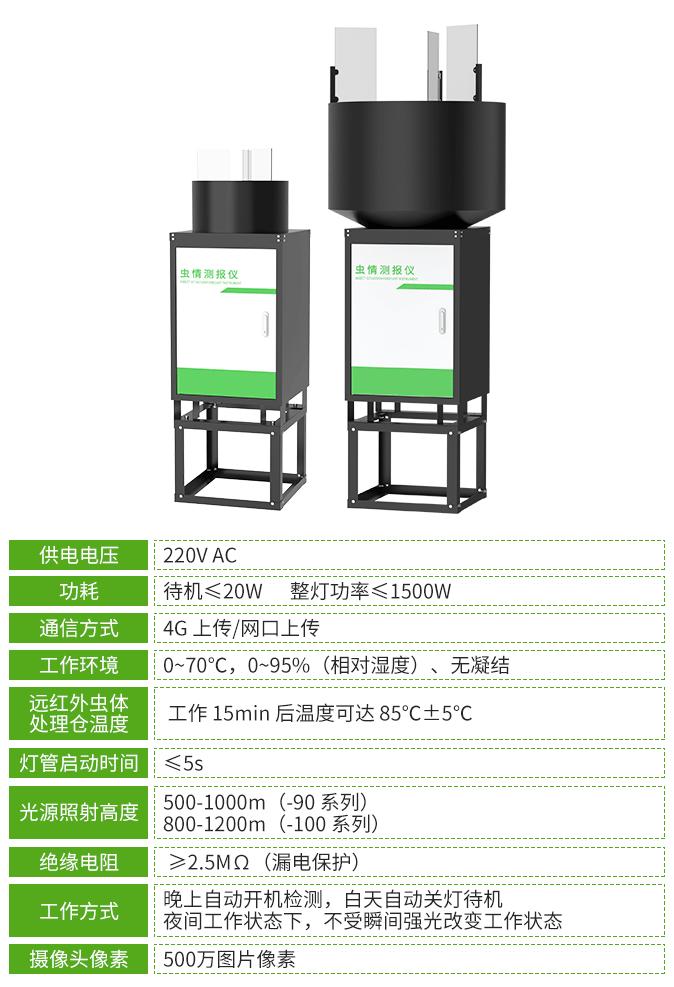 杀虫灯设备采用广谱(波长320nm-680nm多光谱诱虫光源)诱虫方式,拥有外配以频振高压电网触杀的频振式杀虫灯和利用风机转动产生负压气流将虫子吸入到收集器中,使之风干、脱水,达到杀虫目的的风吸式杀虫灯,客户可按需选择。