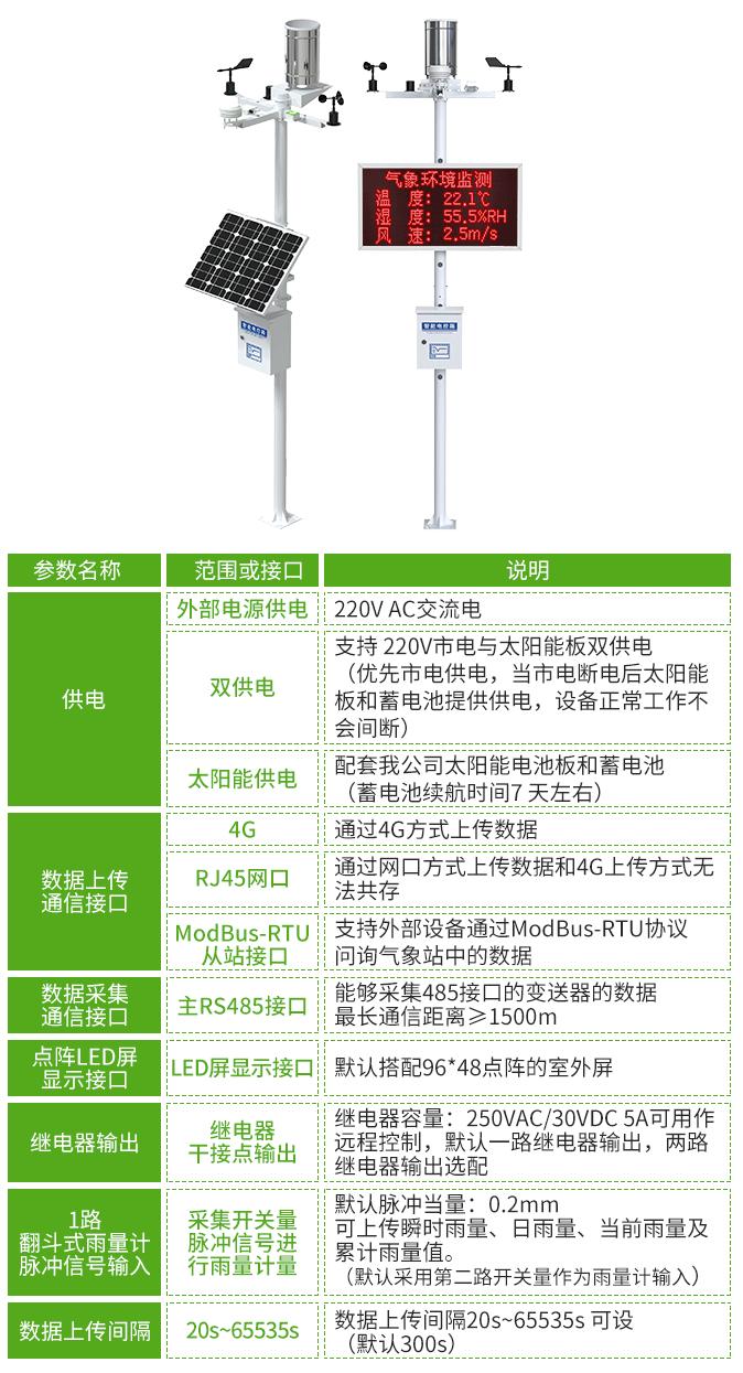 农业气象站是用于自动观测与采集气象数据的设备,它主要由传感器、采集器、通讯接口及系统电源等部分组成。农业气象站能够对环境中的温度、湿度、风速、风向、降雨量、大气压力等数十种环境要素进行实时观测和采集,并通过4G/网口的方式将数据上传至农业云平台。农业气象站支持市电/太阳能供电/双供电的方式,可保障设备长时间稳定工作;用户可根据实际情况自由搭配测量要素,提高监测效率;立杆采用防锈耐腐蚀工艺,能够长期用于恶劣的户外环境。