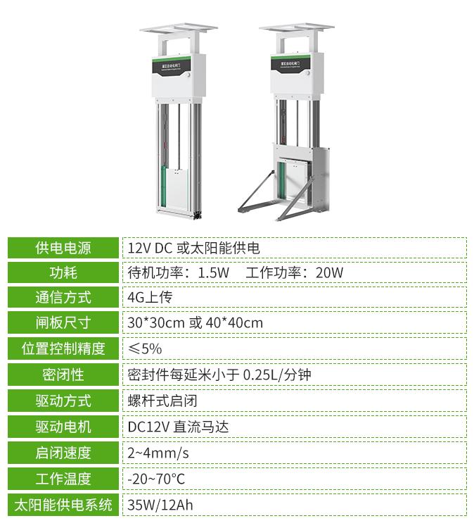 闸门能够实时采集水位、过闸流速等关键数据,并依据预设的目标流量参数,自动调节闸门的开启程度及启闭状态,确保水流管理的精确性与高效性,不仅能提供详尽的用水记录,助力用户精准掌握水资源使用情况,还支持本地直接操控与远程网络监控的双重管理模式。用户可通过农业云平台随时随地查看闸门状态、监控水流动态,实现管理的便捷化与实时化。