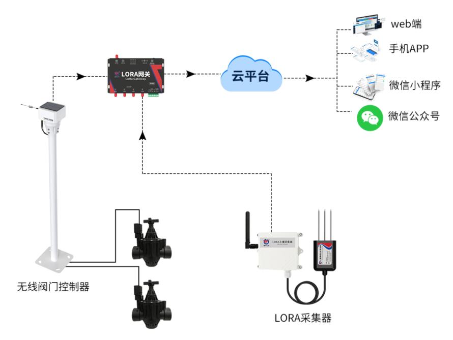 智慧农业无线灌溉系统由LORA网关、LORA土壤采集器、灌溉阀门及农业云平台组成。该系统主要将采集到的农业环境数据通过4G/以太网等方式上传到农业云平台上,进行实时数据的查看及控制(手动/自动/定时)。