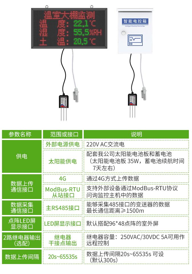 农业室内气象站支持监测空气温湿度、土壤温度与水分、土壤EC(电导率)与PH值、二氧化碳浓度、光照强度等。针对无市电供应场景的特殊需求,农业室内气象站可外接大型室外LED单色显示屏,便于远距离读取数据;也可选配太阳能电池板和蓄电池组工作,解决了偏远地区的长期监测供电难题,确保了监测工作的连续性与稳定性。
