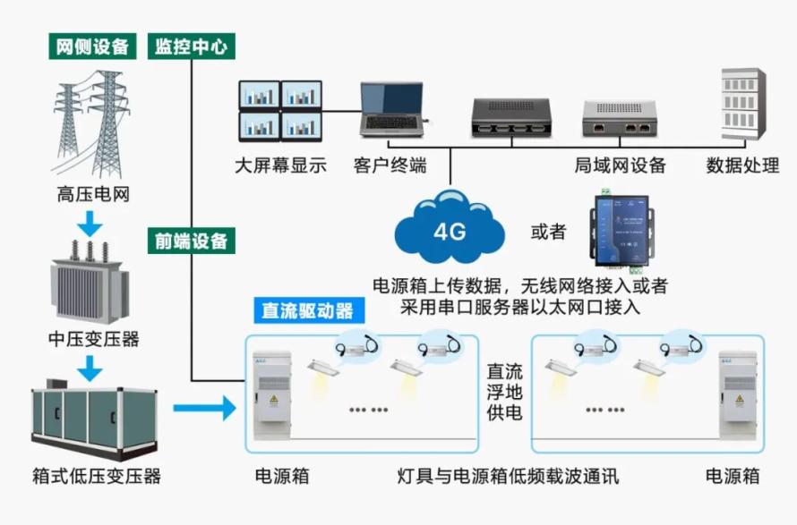 ■该系统将三相380V市电转换成200~400V直流,再由灯具内的直流-直流驱动器转换为LED所需电源,在控灯上采用直流低频载波,使得信号控制稳定可靠;